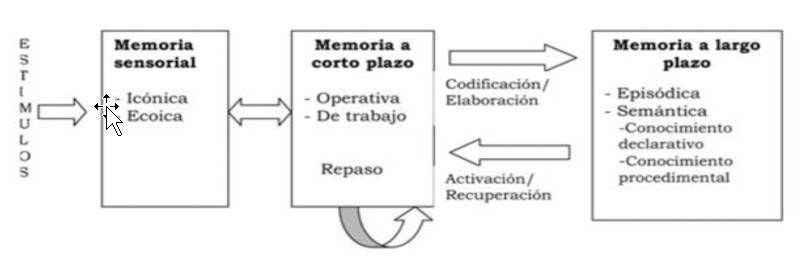La estructura presentada del modelo sobre el procesamiento de la información fluye de izquierda a derecha, los estímulos que llegan a nuestro sistema sensorial (oído, vista, tacto, entre otros) son captados del entorno del individuo para transitar de manera temporal en la memoria sensorial, para luego pasar a la memoria a corto plazo y de ahí́ a la memoria a largo plazo y recuperarla a través de la memoria a corto plazo cuando sea necesario.