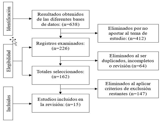 En primera instancia se encontró un total de 638 documentos de las diferentes bases de datos, de los cuales 412 fueron descartados inicialmente al no tener relación con el tema de estudio, también se eliminaron 64 estudios por ser artículos de revisión, duplicados o incompletos, y tras aplicar los criterios de exclusión restantes se separaron 147 archivos, quedando un total de 15 documentos con elegibilidad para la presente investigación (ver Figura 1).