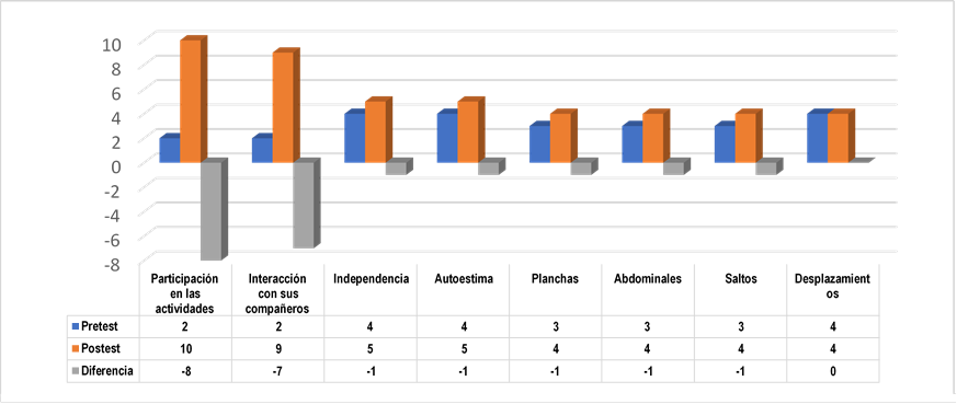 La incorporación e interacción del resto de los estudiantes a la atención personalizada del estudiante con DI queda verificado de esta manera, y así la constatación práctica de la propuesta; lo que incide de manera positiva en la mejora de sus prácticas sociales y físicas del estudiante con DI desde la clase de EF. Como refiere la figura 1 comparando los indicadores referenciales en el pretest y postes.