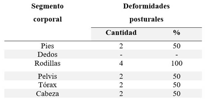 Los por cientos que se muestran en las deformidades posturales por segmento corporal son de la población seleccionada (4 luchadores). La mayor incidencia se encuentra en el segmento rodillas, las cuatro son varas. Esta deformidad puede estar presente debido a la influencia de las deformidades presentes en los pies.