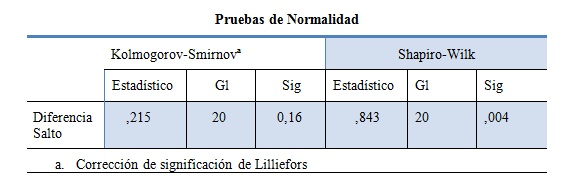 Se realizaron pruebas de normalidad para evaluar la diferencia en el salto. Tal y como se presenta en la Tabla 2, la prueba de Kolmogorov-Smirnov proporcionó un análisis estadístico de 0.215 con 20 grados de libertad y un valor p de 0.16, indicando que no se rechaza la hipótesis nula de normalidad. Sin embargo, la prueba de Shapiro-Wilk presentó un estadístico de 0.843 y un valor p de 0.004, lo que sugiere que los datos no siguen una distribución normal.