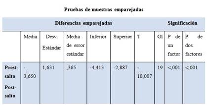 Las pruebas de muestras emparejadas como se presenta en la Tabla 3, revelaron una media de diferencias de -3.650 entre el salto previo y el posterior, con una desviación estándar de 1.631. El intervalo de confianza del 95% para la diferencia se encuentra entre -4.413 y -2.887. El valor t fue de -10.007 con 19 grados de libertad, y la significación estadística fue p < 0.001 tanto para pruebas de un factor como para dos factores, indicando una diferencia notable en el rendimiento después de aplicar el programa de preparación física.