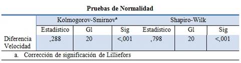 Se realizaron pruebas de normalidad para evaluar la distribución de las diferencias en velocidad como se muestra en la Tabla 6. Los resultados obtenidos de la prueba de Kolmogorov-Smirnov indicaron un estadístico de 0.288 y un valor p menor a 0.001, lo que sugiere que los datos no se distribuyen normalmente. Asimismo, la prueba de Shapiro-Wilk mostró un estadístico de 0.798 con un valor p también inferior a 0.001, confirmando no tienen una distribución normal.