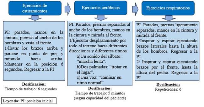 Es importante agregar que se escogieron 15 ejercicios, dirigidos esencialmente hacia la potenciación de actividades donde se emplearan en su conjunto, ejercicios físico-terapéuticos de estiramiento, ejercicios aeróbicos y de respiración, estructurados y dosificados, diseñados para actuar de forma sinérgica en la reducción de la fatiga muscular. Estos ejercicios fueron tomados de García et al. (2021), Saavedra (2022) y Rodríguez Gámez (2023). En la figura 1, se muestra su concepción general.