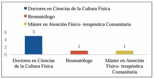 A partir de los criterios de selección, se determinó que fueran siete los especialistas, evaluadores de la propuesta. La figura 2 muestra la distribución del grupo.