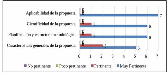 En cuanto al indicador 1; cinco especialistas (71,4%) lo valoraron de muy pertinente, mientras que dos de ellos (28,5%), lo analizó de pertinente. Los especialistas enfatizaron además que las características de la propuesta están en concordancia con los elementos que la caracterizan. Respecto al indicador 2 y 3; seis especialistas (85,7%) los vieron de muy pertinente, mientras que uno (14,2%) de pertinente. Con relación al indicador 4; el 100% de los especialistas los estimaron de muy pertinente.