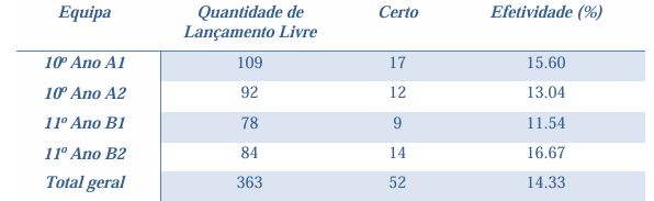 Tabela 4. Resultados da efetividade dos estudantes que constituem a amostra, na execução do teste de 20 lançamentos livre