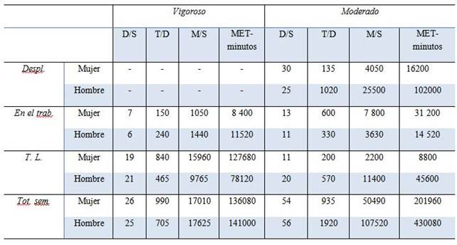 Los niveles de actividad física referidos con la aplicación del GPAQ evidenciaron la autopercepción que tienen los participantes en el estudio acerca del tiempo y la intensidad en que practican actividad física en los tres momentos del día: en el centro laboral o de estudio, durante el desplazamiento desde y hacia el hogar y en el tiempo libre. Ello permitió calcular los MET-minutos consumidos semanalmente.