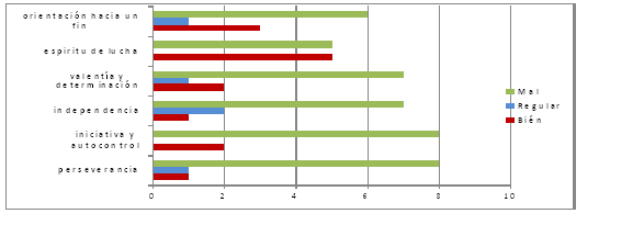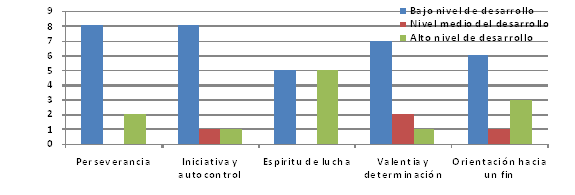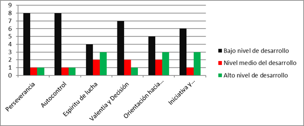 En cuanto al espíritu de lucha, 40% tiene un nivel bajo de desarrollo, 20% tiene un nivel medio de desarrollo y 30% tiene un nivel alto de desarrollo. La valentía y la decisión son otras cualidades que muy bajo nivel de desarrollo tienen, representado por 70% de la población, 20% con un nivel medio y 10% con un nivel alto de desarrollo. En cuanto a la iniciativa y la disciplina 30% tiene un nivel alto de desarrollo, 10% tiene nivel medio y solo 60% tiene un nivel bajo de desarrollo.