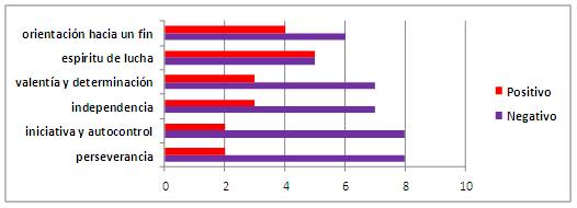 En cuanto a la independencia, 70% de la población, fueron evaluadas de mal. Las dos restantes 20% fueron evaluadas de regular y un 10% fue evaluado de bien. La valentía y la determinación, 70% fueron evaluadas de mal. De las tres restantes, una (10%) fue evaluada de regular y las otras dos (20%) fueron evaluadas de bien. Con respecto al espíritu de lucha, 50% de la población fue evaluada de bien y el 50% fue evaluada de mal. En cuanto a la orientación hacia un fin, seis tenistas fueron evaluadas de mal. Una fue evaluada de regular y tres fueron evaluadas de bien.