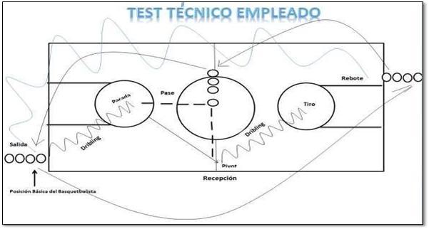 Como se puede apreciar en el test (Gráfico A.) que se muestra a continuación se aplica en todo el terreno de Baloncesto, principalmente en dos formaciones, que garantiza la dinámica para obtener los datos investigativos. Se parte de evaluar la posición básica del Baloncestista, como elemento esencial para el dominio técnico de deporte, desde esa posición, con posesión de la pelota, se realiza drible con desplazamiento de manera diagonal en dirección a la parte superior de la botella. Una vez llegado a esa posición se realiza la parada por salto a la cuenta de uno, quedando de frente al jugador ofensivo número dos que se encuentra en la mitad del terreno; efectuando pase de pecho con dos manos.