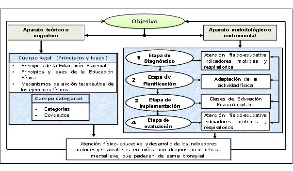 La construcción de la metodología como aporte científico, requiere de un aparato metodológico o instrumental que oriente el proceso, partiendo de la necesidad de valorar el por qué, y el para qué se elabora, en tal sentido se precisa la necesidad de concebir un procedimiento que condicione la atención físico-educativa a niños con diagnóstico de retraso mental leve, que padecen de asma branquial, dentro de las clases de Educación Física Adaptada, para favorecer el desarrollo de sus indicadores motrices y respiratorios, este aparato metodológico quedó conformado por cuatro etapas, la de exploración y diagnóstico, la planificación implementación y evaluación.