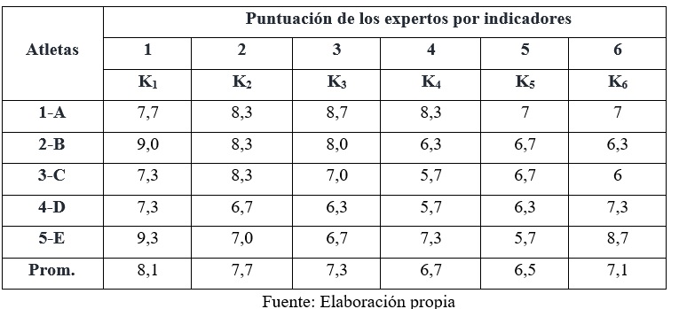 puntuación otorgada por los expertos a los atletas en cada indicador. (Ver