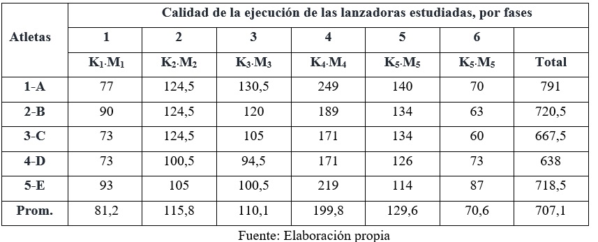 7. Determinación de la calidad de la ejecución de las atletas estudiadas por indicadores. (Ver tabla 4)