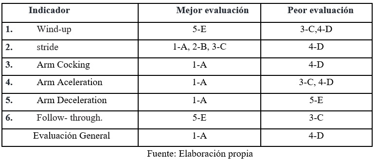A partir de los resultados obtenidos de la evaluación por indicadores, así como del total general, se precisaron las lanzadoras mejores y peores evaluadas, lo que se refleja en la tabla 5 que aparecen a continuación. (Ver tabla 5)