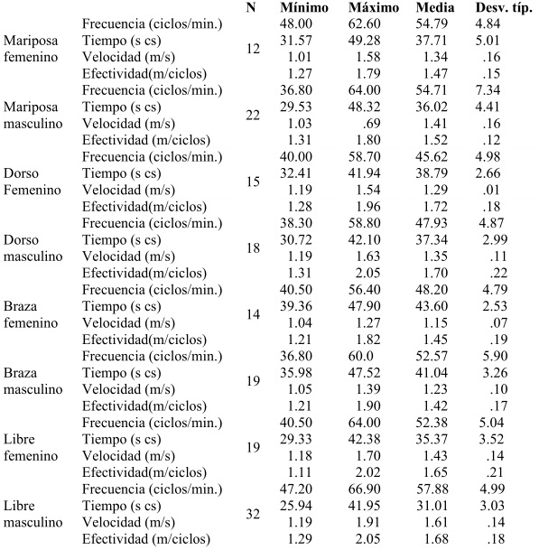 Si se tiene en cuenta la frecuencia de brazadas, como media, entonces el orden (descendente) de las técnicas de nado se establece por sexo de la siguiente manera: Femenino: mariposa, libre, braza y dorso. Masculino: libre, mariposa, braza y dorso. Además, se obtienen rangos para la edad de este indicador que fluctúan como se muestra en la tabla no.2.