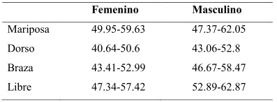 En el análisis comparativo entre los sexos se determinó que los valores de los indicadores estudiados no resultaron suficientes para que se establezcan diferencias significativas en las técnicas de mariposa y dorso. En la técnica de braza existen diferencias medianamente significativas y en la libre son de tipo significativas.