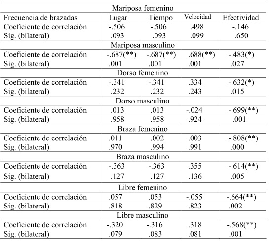Se utilizó igualmente el coeficiente de correlación rho de Spearman para el análisis de la frecuencia de brazadas y efectividad de nado (ver tablas 3 y 4).