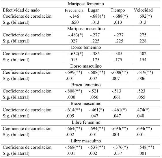 Estadísticos de correlación (rho de Spearman) de la efectividad de nado