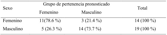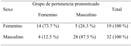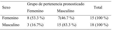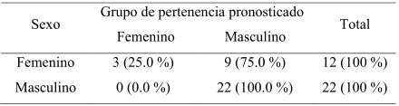 En cambio, para el estudio de la técnica de braza el conjunto de variables (tiempo de competencia, efectividad de nado, frecuencia de brazadas y velocidad de nado) sí distingue los nadadores del sexo femenino de los del sexo masculino. Esos resultados se muestran en la tabla 7 donde más del 75 % del total de los casos están bien clasificados.