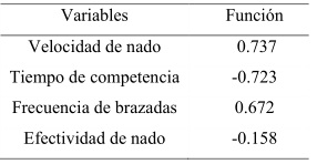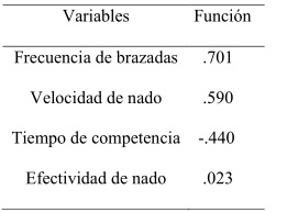En la matriz de estructura, que contiene por filas los coeficientes de correlación de las funciones discriminantes con las variables originales, se muestra que la velocidad de nado, tiempo de competencia y frecuencia de brazadas son los indicadores que más contribuyen a la discriminación entre los sexos.