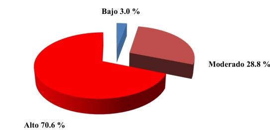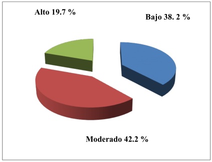 los valores de bajo (38.2 %), moderado (42.2 %) y alto (19.7 %), donde el moderado