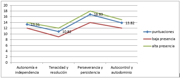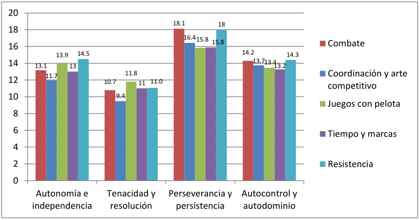La mayoría de las puntuaciones obtenidas se encuentran en el rango de presencia media, a excepción de las dimensiones autonomía-independencia, con una baja presencia en la agrupación arte competitivo (11.7) y alta presencia en la de resistencia (14.5). Por su parte perseverancia-persistencia logró alta presencia en los deportes de combate (18.1) y en los de resistencia (18).