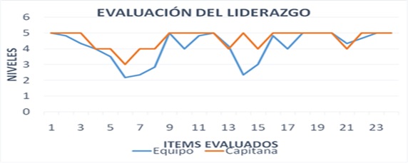 Según la escala de evaluación del liderazgo aplicada a la capitana y a entrenadores y jugadoras escogidas con la finalidad de contrastar el nivel en que se ubicó a sí misma la líder (línea roja) y el nivel dado por la impresión de su liderazgo en el equipo (línea azul), en 16 de los ítems la capitana considera estar en el nivel más alto, con un 66.6 %, mientras que en siete se ubica en el cuarto nivel (16 %) y solo en uno (ítem seis) se autoevalúa en el nivel tres, que es medio. Ver figura 1.