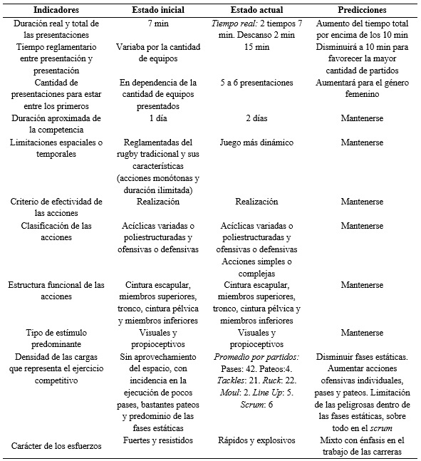 Para una acertada predicción del ejercicio competitivo es necesario un estudio de las tendencias, en el cual se realice una valoración del estado inicial y final de cada uno de los indicadores internos y externos, lo que permite la caracterización de la actividad durante la 3.ª, 4.ª y 5.ª etapas evolutivas para el rugby siete.