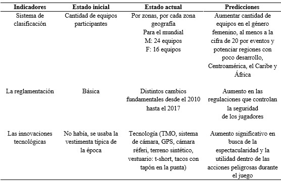 Desde esta perspectiva se aprecia que después de la descripción de cada uno de los indicadores seleccionados para estudiar la evolución histórica de la actividad competitiva en el rugby siete, existen las condiciones para aproximarse al pronóstico de las características que presentará en el futuro inmediato.