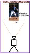 Sobre el montículo, de lado al plano de lanzamiento, a una distancia de 4 m, se situó una cámara de video, fija sobre un trípode en forma perpendicular al plano del mismo, de manera que el lente óptico formara un ángulo de 90º con la línea media del plano de movimiento, quedando aproximadamente a la altura del centro de gravedad del cuerpo (CGC). (Instalación de medición)