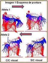 Durante el procesamiento de las imágenes se obtuvo el comportamiento de los indicadores cinemáticos medidos, así como el esquema de postura del movimiento de cada atleta analizado. (Imagen 1)