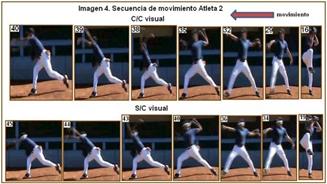 La utilización del análisis cinemático del movimiento de lanzamiento de recta desde la posición de frente con control y sin control visual, facilito detectar las causas de la deficiente ejecución del movimiento en dos lanzadores, existiendo errores que se cometen en la fase de descenso de la pierna de péndulo, cuando se traslada el centro de gravedad anticipadamente hacia adelante, hasta el apoyo, no permite que se acumule cantidad de movimiento, y que este no pueda transmitirse a la mano que lanza, provocando que los lanzamientos se realicen solo con la fuerza que provocan los músculos de su brazo de lanzar, despreciándose toda la ayuda que puede provocar todo el resto del cuerpo en la acción.