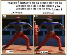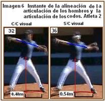 El atleta 2 (imagen 6), en este instante, para ambas pruebas logra alinear las articulaciones de los hombros con la de los codos, pero no en la horizontal, más bien en dirección diagonal, cuestión también que constituye otro error, porque la dirección de los codos se emplean como guía del lanzamiento, y este debe realizarse en la horizontal y no en la dirección diagonal. Además incluye en esta fase de descenso de la pierna de péndulo, el comienzo del impulso de la mano que lanza hacia el frente, sin haber apoyado el pie de la pierna de péndulo.