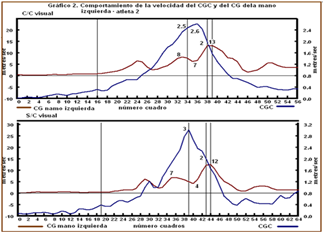 El comportamiento de la velocidad el CGC y el CG de la mano derecha en el atleta 1 cuando realiza el movimiento con control visual, logra disminuir la velocidad del CGC de 2,5 m/s en el instante del comienzo de la fase de impulso de la mano que lanza hasta 2,3 m/s, momento en que la mano aumenta su velocidad del 5 m/s a 14 m/s en el instante de lanzar, velocidad que es transferida a la pelota al comienzo de su movimiento. Sin embargo en la prueba de lanzamiento sin control visual, en comparación con la primera prueba, alcanza valores mayores de velocidad. En el comienzo de la fase de impulso de la mano que lanza hacia el frente, el CGC se movió a 2,6 m/s, disminuyendo en el instante del lanzamiento hasta 2.4 m/s. La velocidad del CG de la mano comienza a aumentar hacia el frente durante su impulso de 5 m/s a 15m/s en el instante de soltar la bola. (Gráfico 1)