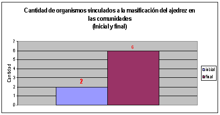 Cantidad de organismos vinculados con la masificación del Ajedrez en la comunidad. De los seis organismos que se encuentran en la comunidad, todos brindan apoyo a las actividades ajedrecísticas que se desarrollan para la masificación; los mismos cooperan con los locales, participan en las actividades, divulgan los resultados en sus matutinos e incluyen equipos de sus entidades en las competencias ajedrecísticas comunitarias. En una entrevista realizada a los presidentes de los Comité de Defensa de la Revolución (CDR) y líderes comunitarios, estos están satisfechos con el apoyo de las organizaciones a las actividades ajedrecísticas.