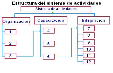 Quedó compuesto por 12 actividades, 3 dirigidas a organizar la comunidad, 3 a la capacitación y 6 de integración. Se propone su realización en este orden pues no se garantiza su funcionamiento si se altera el mismo. El gráfico 1 representa las relaciones presentes en el sistema de actividades.