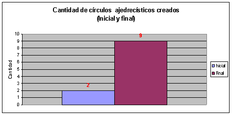 Al constatar los resultados del pretest o prueba inicial con los del postest o prueba final (Gráfico 2) en el indicador cantidad de círculos ajedrecísticos creados se tuvo una mejoría, pues luego de aplicada el sistema de actividades se logró un aumento de siete círculos ajedrecísticos.