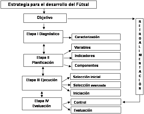 De tal forma la estrategia que se concibe debe entenderse como un plan de acciones lógicas a ser visto de forma consciente, dirigida a la solución de una situación específica sobre la base de objetivos concretos lo cual se contempla como la piedra angular de los procesos formativos del futsal.