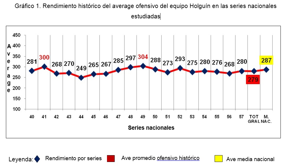 En el análisis de los resultados se inicia con la interpretación de las estadísticas tradicionales, donde se muestra en el gráfico 1, el average histórico por series desde la XL hasta la LVII, con el objetivo de identificar la media nacional de todos los equipos participantes, la cual arrojó un promedio de 287, que al compararlo con el rendimiento histórico del equipo Holguín, los autores se percatan que está por debajo de la media nacional con una cifra de 279.