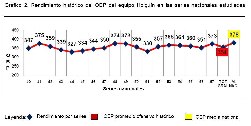 A continuación se hace una valoración donde la sabermetría hace su aporte al Béisbol. El (OBP) que no es más que el porcentaje de embasado, es la estadística que comenzó la revolución sabermétrica, al demostrar que es más importante evitar que te hagan out (lo que mide el OBP) a dar un hit (lo que mide el average). Al valorar los resultados históricos, se registró una media nacional de 378, con un promedio histórico de Holguín de 354, es decir, no se logra superar el porcentaje de embasados.