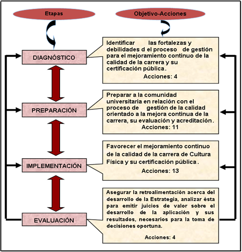 Para dar solución al problema planteado se elaboró una Estrategia de acreditación que favorece el mejoramiento continuo de la calidad de la carrera de Cultura Física de la Universidad de Holguín y su certificación pública.