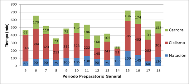 El presente estudio tuvo como objetivo describir la carga de entrenamiento, la distribución del volumen de entrenamiento y la intensidad del Periodo de Transición (PT), Periodo Preparatorio General (PPG), Periodo Preparatorio Específico (PPE) y Periodo Competitivo (PC) en la temporada de un triatleta recreacional cuyo principal objetivo durante el PPE fue la participación en una competición de ½ Ironman y participación en el circuito regional de triatlón durante el PC sobre distancia Olímpica (1,5 natación, 40 km ciclismo y 10 km carrera).