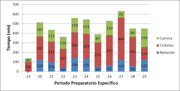 Durante el PPE el atleta tomó parte en 2 competiciones de duatlón (semanas 22 y 25), 1 de triatlón distancia sprint (semana 27) y la semana 29 participó en un ½ Ironman. Durante este periodo, el trabajo de fuerza disminuyó a un día por semana con cargas externas y con ejercicios multiarticulares.