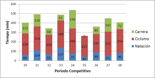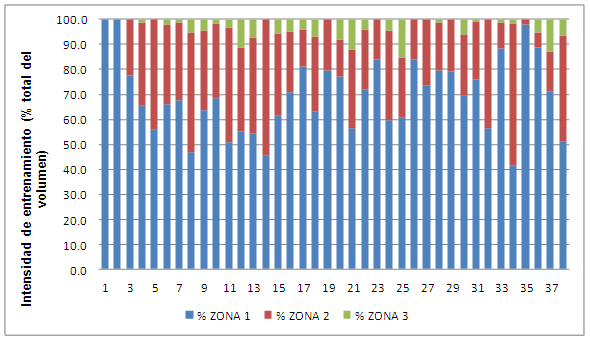 Durante la temporada de 38 semanas del triatleta, 304 sesiones fueron registradas en su diario personal de entrenamiento. Así mismo el volumen total, durante el macrociclo, en función del segmento fue de 54h y 36 min para la natación, 160horas y 8 min para el ciclismo y 68 horas y 32 min para la carrera. En la Figura 4. se observa la distribución de la intensidad semanal durante el macrocilo completo.