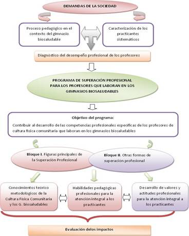 This article shows synthetically, the essential and most important elements of research on the professional performance of the teachers of physical culture who work in the bio healthy gyms. From a diagnostic, shortcomings were identified in the specific skills of these teachers, this led to approach the following objective: to develop a program for the professional development of teachers of the Community Physical Culture working in the bio healthy Gyms in Holguin. It was developed a deep consultation with critical literature, the methodological indications of INDER and documents of the 2014-2015 school year. There were used theoretical methods as the analytic-synthetic and inductive-deductive, as well as other methods and tools for collecting, processing and interpretation of information. An analysis of this program was conducted by 30 experts of Physical Culture and Sport, and they all thought it is relevant and useful for the professional development of teachers of Physical Culture bio healthy gyms.