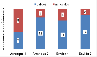 La evaluación técnica de las atletas en la primera medición arrojó como resultados que estas presentaban un 40 % de intentos no válidos, generados fundamentalmente por el gran número de errores que presentaban en las diferentes fases del movimiento, pudiendo identificarse aquellos que más se repetían en cada una de las pruebas, aspectos que constituyeron la base para el diseño e implementación de las tareas dirigidas a mejorar la ejecución técnica en los ejercicios.