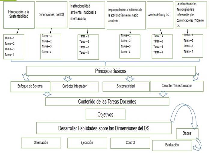 Fundamentals: the system of teaching tasks contributes to the introduction of the dimensions of sustainability in the programs of the discipline of Physical Education, for which they acquire great relevance at present due to the current challenges of climate change and economic dynamics. Objectives: to elaborate a system of teaching tasks to contribute to the academic formation of students and professors and to revert to mitigate or delay the negative effects of overexploitation of natural resources. Methods: a qualitative study was carried out at the Higher Metallurgical Mining Institute of Moa (2016). We used theoretical methods such as; the analysis-synthesis, induction-deduction, historical-logical, hypothetical-deductive. At the empirical level, the interview with key informants, the survey and the nominal group were used. The main result obtained is the realization of a system of tasks that contributes to improve the knowledge on the dimensions of the sustainability of the students of the Geological Engineering career from the perspective of Physical Education, as well as the validation of said system for its possible application. The state of the art was carried out in addition to the contextualization of the problem, as well as the diagnosis that allowed to assess the level of knowledge that students and professors have on the dimensions of Sustainable Development.