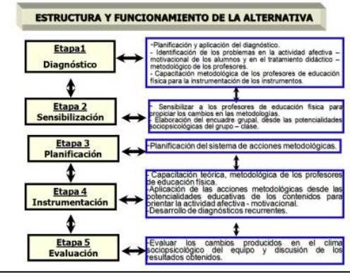 La alternativa metodológica constituye un camino científico práctico para lograr, una transformación en el tratamiento didáctico-metodológico a la esfera afectiva-motivacional de los practicantes del décimo año de la EGB en la clase de Educación Física. La misma se estructura a partir de los siguientes componentes: objetivo general y específicos, etapas, fases y acciones y evaluación.