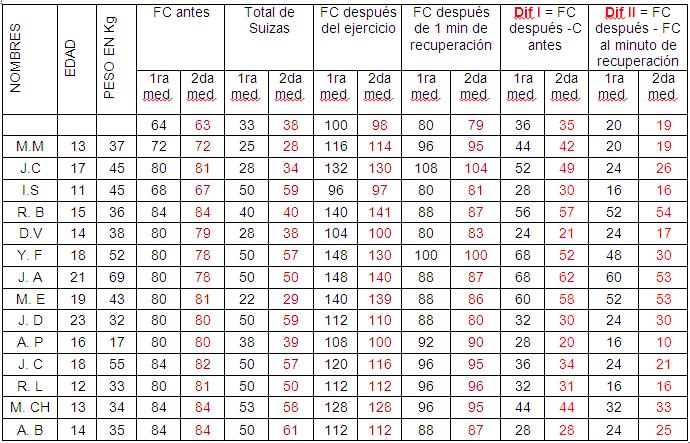Parámetros antropométricos básicos: peso, frecuencia cardiaca en reposo, después del ejercicio y después de un minuto de recuperación.